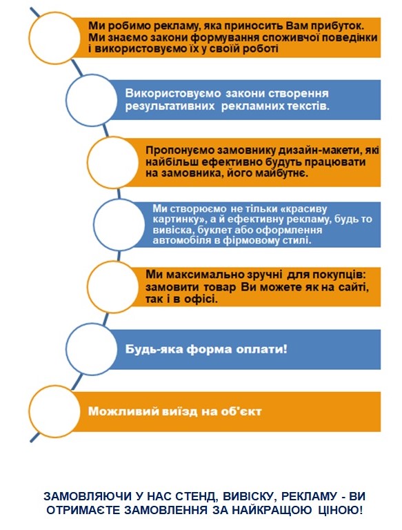 Пишіть, телефонуйте та замовляйте стенди, плакати, рекламні конструкції, які зроблять вам дієву рекламу, а простір - інформативним, розвиваючим і стильним.