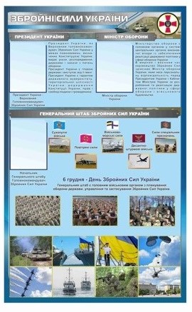 В умовах військового стану безліч професій працюють, щоб забезпечити перемогу над ворогом. Для вивчення організаційної структури Збройних сил України на уроках «Захисту України», військових вузах та частинах мипрезентуємо різні за дизайном стенди, на яких подана організаційна структура, бойовий склад та оснащення різних родів військ ЗСУ.