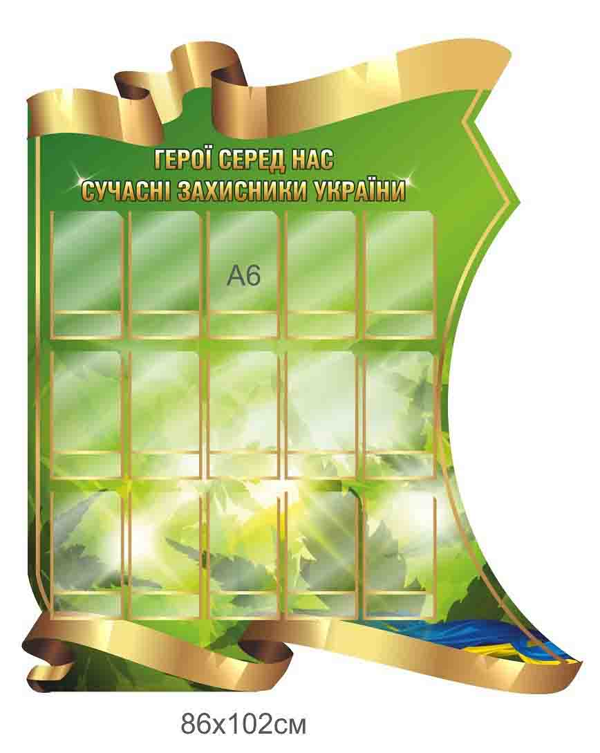 Цей стенд присвячений сучасним воїнам, які захищають Україну на передовій, волонтерам та людям, що підтримують армію. Він містить 12 кишень формату А6, у які можна розмістити фотографії з короткими біографічними даними героїв. Такий формат дозволяє швидко оновлювати інформацію, додаючи нові матеріали про тих, хто щодня ризикує життям заради майбутнього країни.