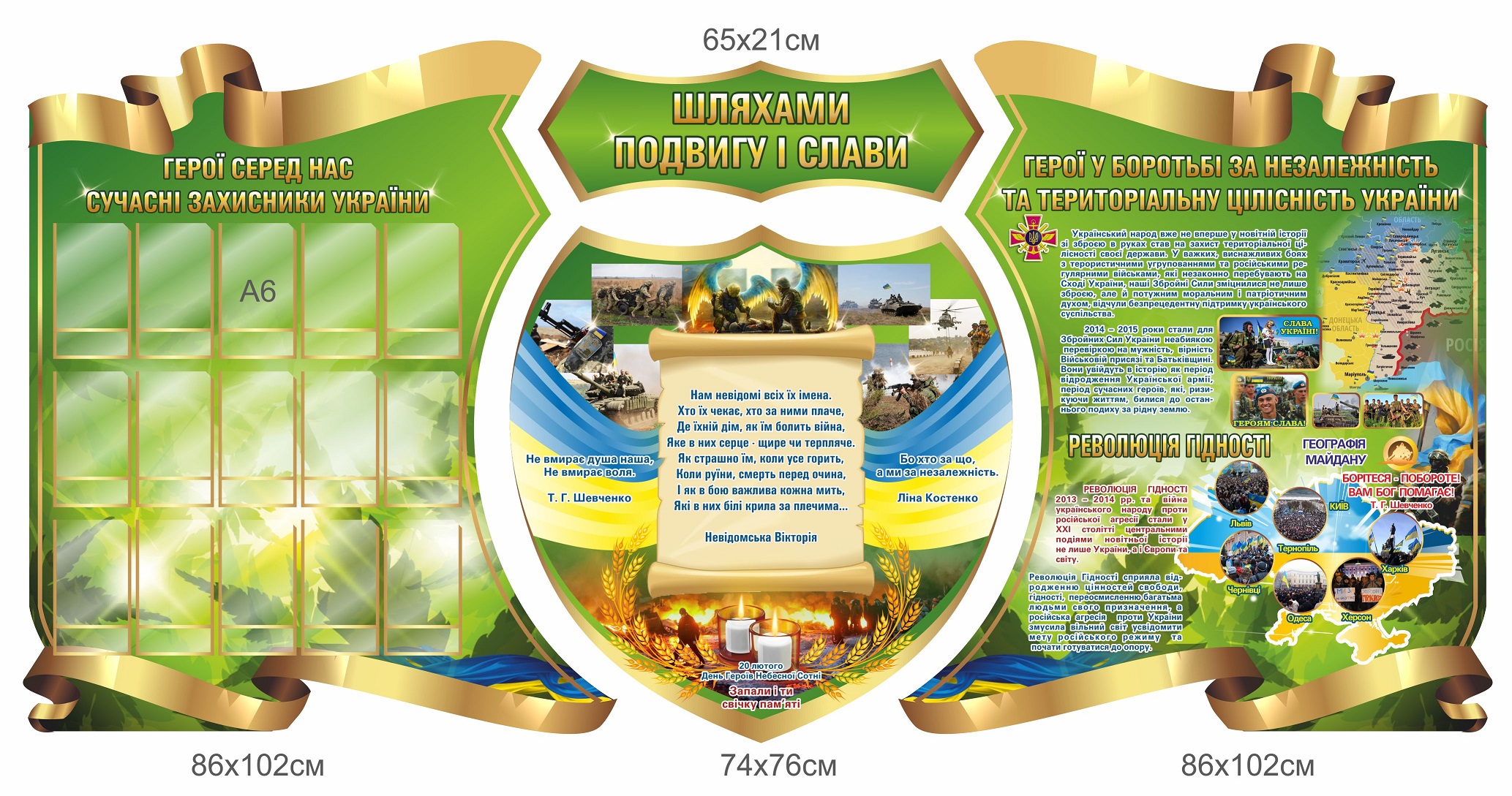 Цей стенд займає центральне місце у комплекті й символізує героїчний шлях України крізь століття. У центрі зображена почесна грамота із патріотичними віршами Тараса Шевченка та Ліни Костенко, які надихають і нагадують про незламний дух українців.