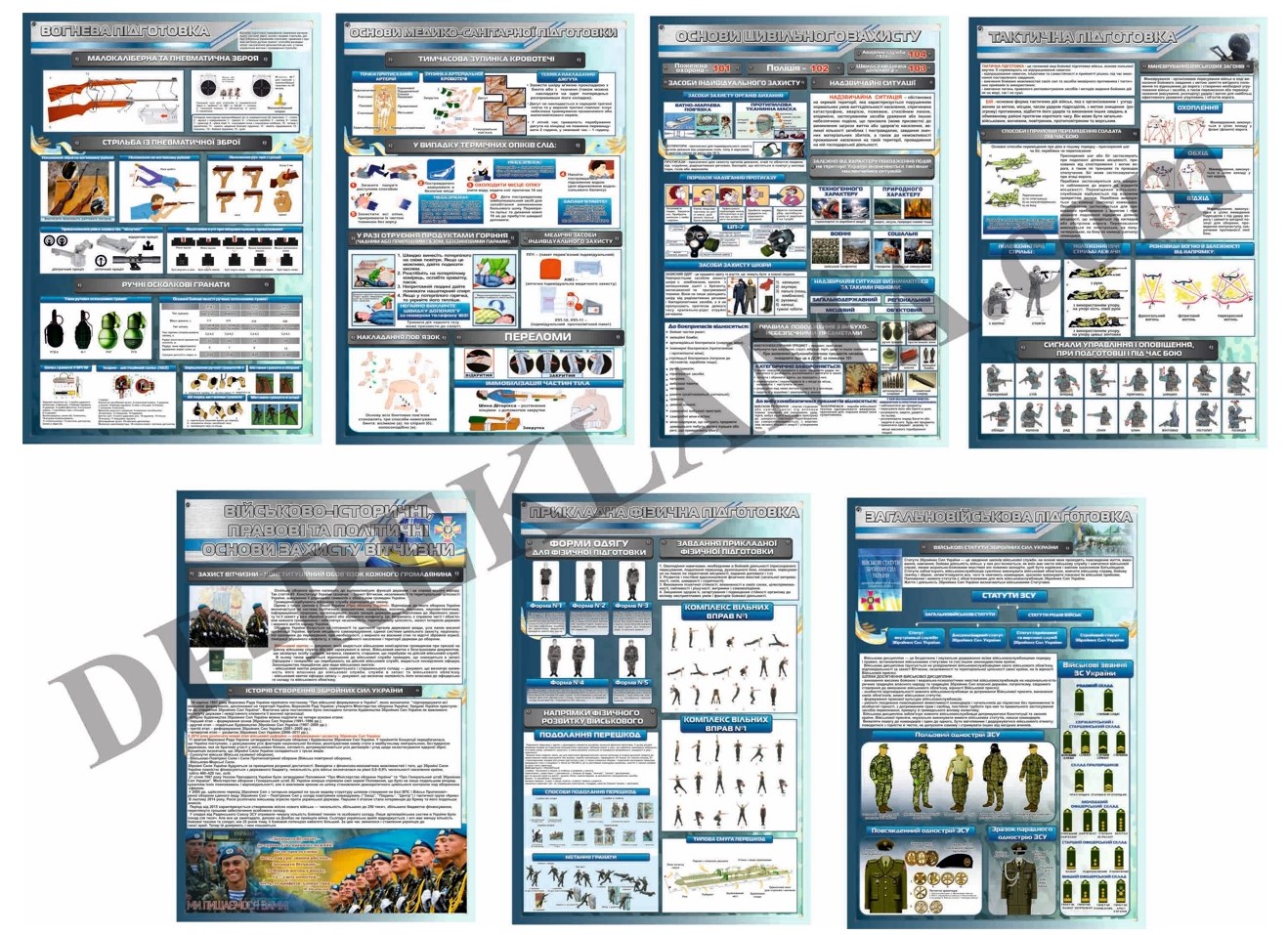 Ми виготуємо для вас стенди, банера, комплекти стендів за основними темами підготовки військовозобов’язаних: бойова підготовка, фізична підготовка, тактична медицина, топографія, формування контраварійних навичок, знайомство з правилами ведення бойових дій на урбанізованій місцевості, інженерна підготовка та формування почуття самозбереження та взаємодопомоги. Цей список — головні тези оформлення інформаційних куточків для місць навчання солдатів й офіцерів ВСУ.